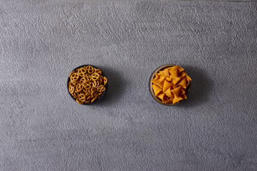 وجبات خفيفة متنوعة في أوعية فخارية على خلفية رمادية