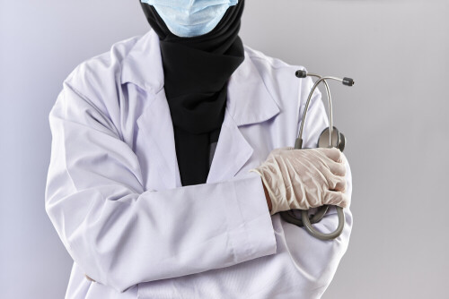 طبيبة ترتدي عباءة وملابس طبية في أوضاع متعددة
