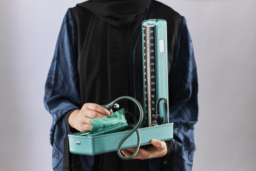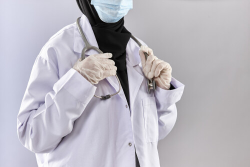 طبيبة ترتدي عباءة وملابس طبية في أوضاع متعددة