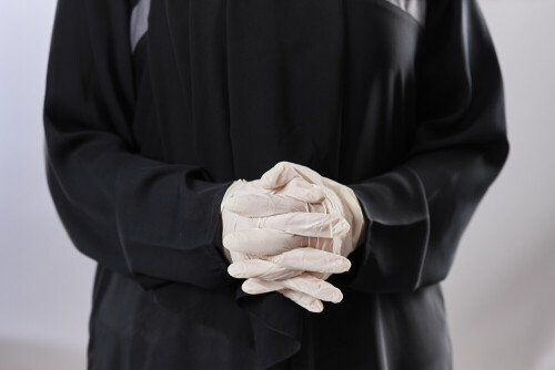 طبيبة ترتدي عباءة وملابس طبية في أوضاع متعددة