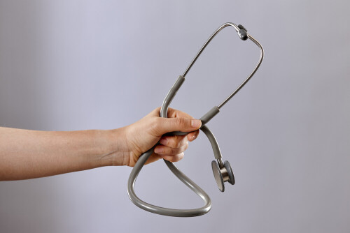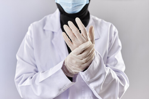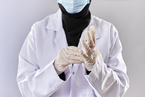 طبيبة ترتدي عباءة وملابس طبية في أوضاع متعددة