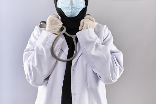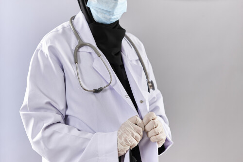 طبيبة ترتدي عباءة وملابس طبية في أوضاع متعددة