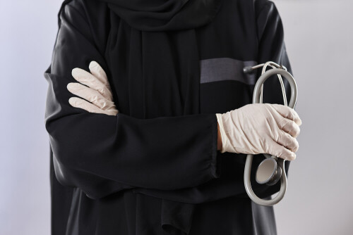 طبيبة ترتدي عباءة وملابس طبية في أوضاع متعددة