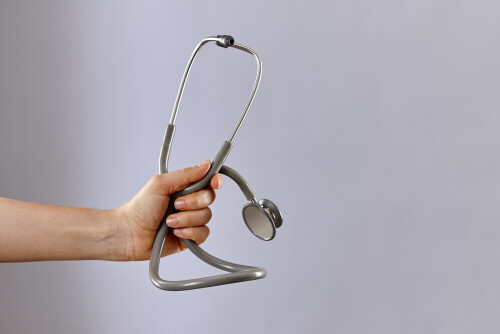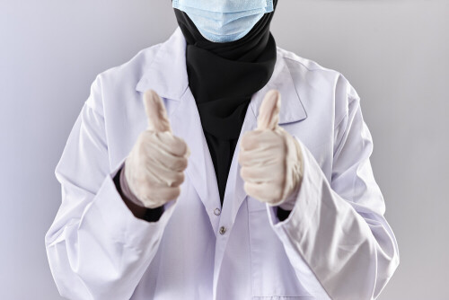 طبيبة ترتدي عباءة وملابس طبية في أوضاع متعددة