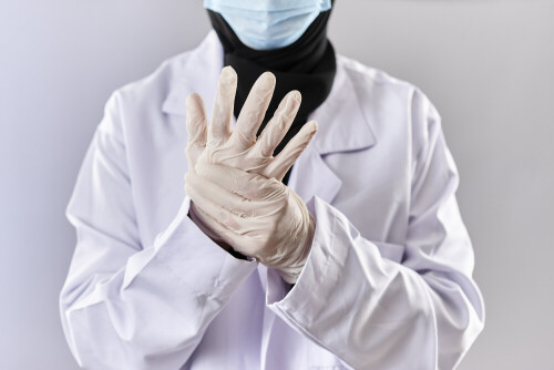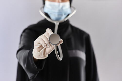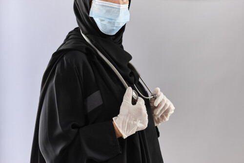 طبيبة ترتدي عباءة وملابس طبية في أوضاع متعددة