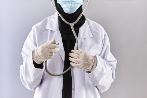 طبيبة ترتدي عباءة وملابس طبية في أوضاع متعددة