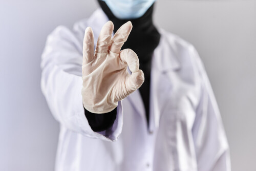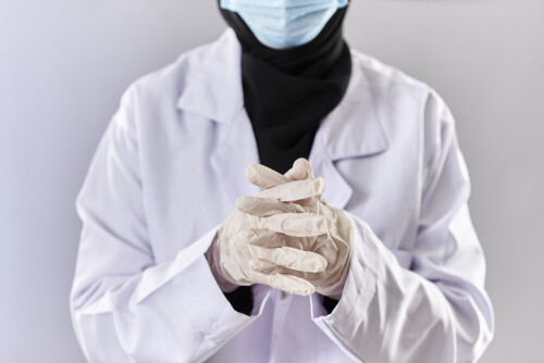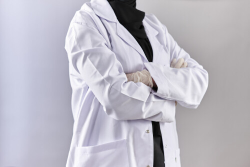 طبيبة ترتدي عباءة وملابس طبية في أوضاع متعددة