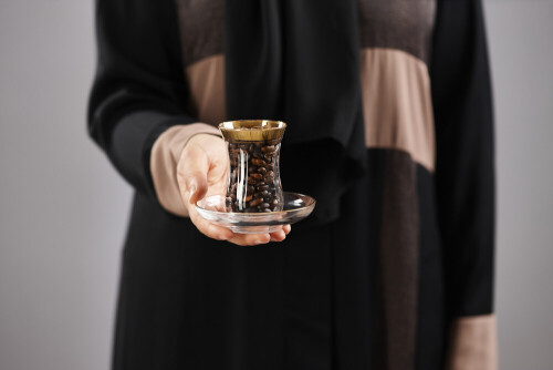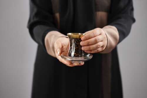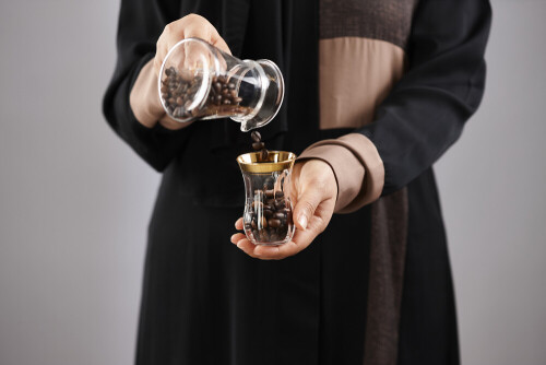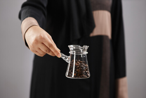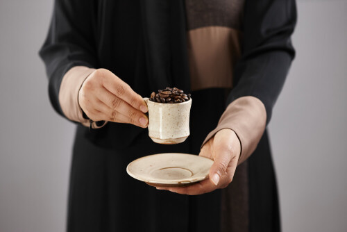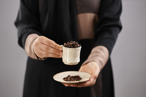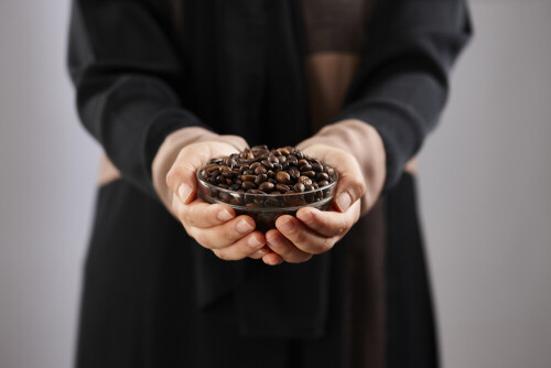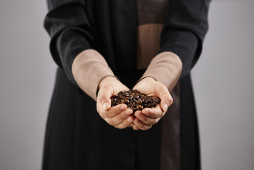 امرأة ترتدي عباءة تحمل أنواع مختلفة من حبوب القهوة في أوضاع متعددة