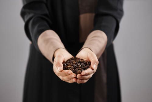 امرأة ترتدي عباءة تحمل أنواع مختلفة من حبوب القهوة في أوضاع متعددة