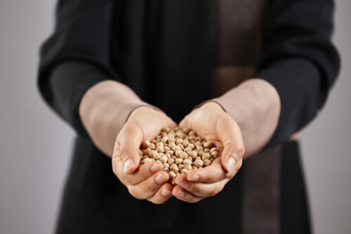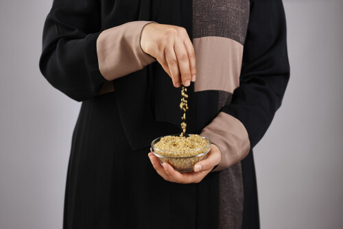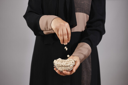امرأة ترتدي عباءة تحمل أنواع مختلفة من البقوليات في أوضاع متعددة