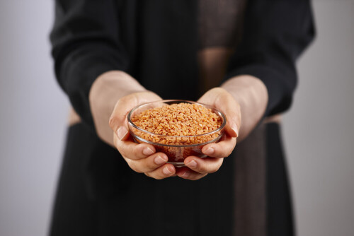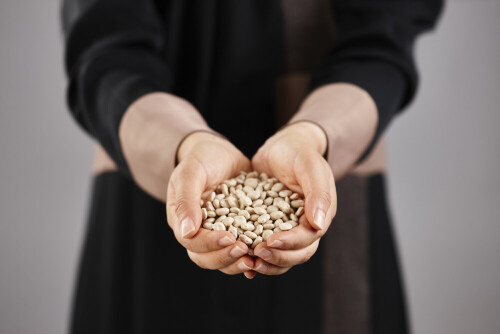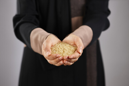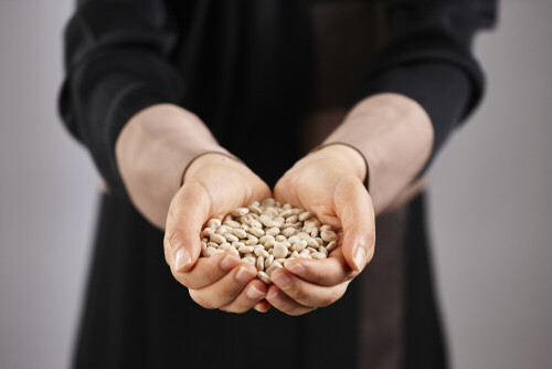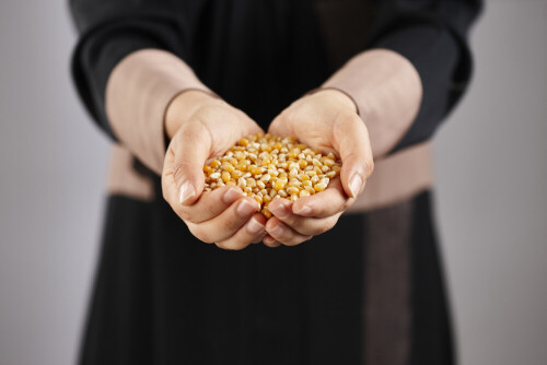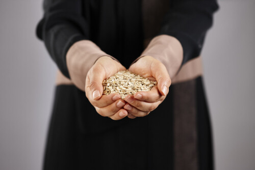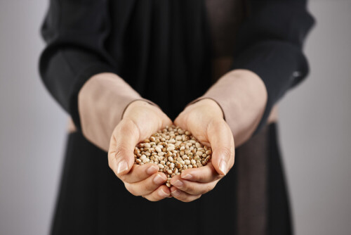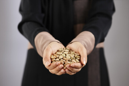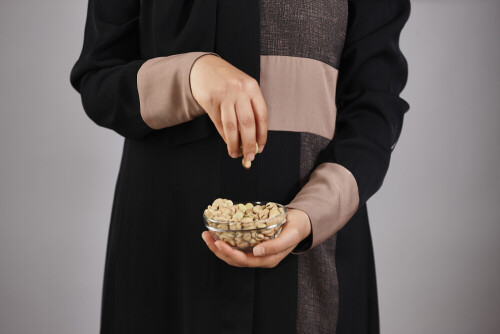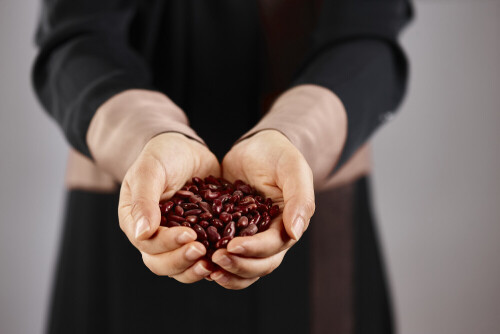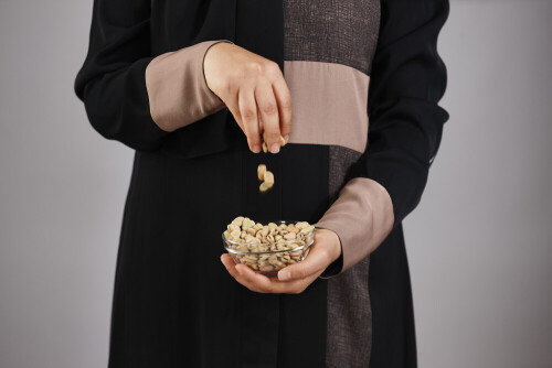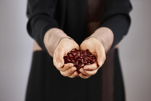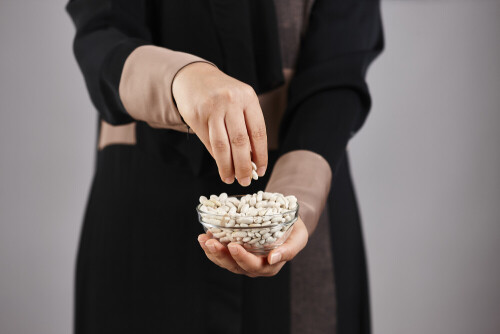 امرأة ترتدي عباءة تحمل أنواع مختلفة من البقوليات في أوضاع متعددة