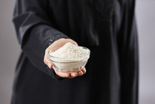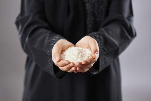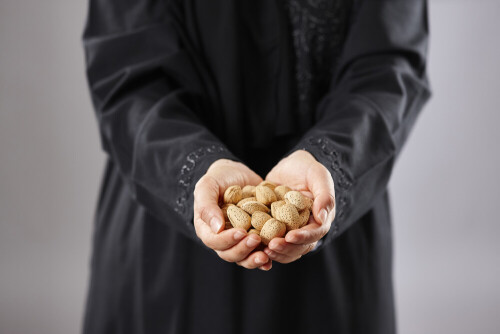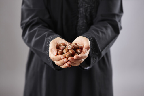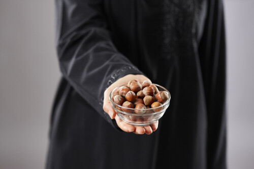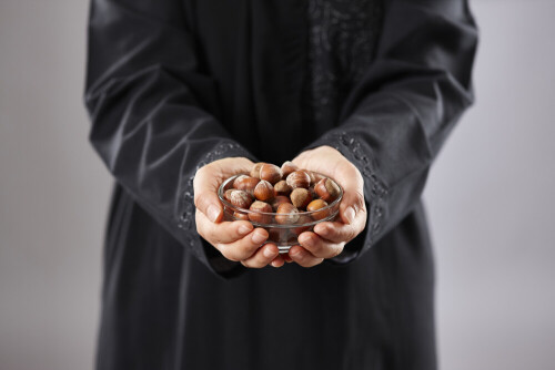 امرأة ترتدي عباءة تحمل أنواع مختلفة من المكسرات في أوضاع متعددة