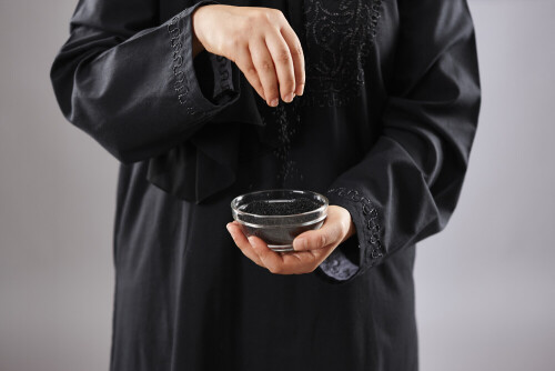 امرأة ترتدي عباءة تحمل أنواع مختلفة من البهارات في أوضاع متعددة