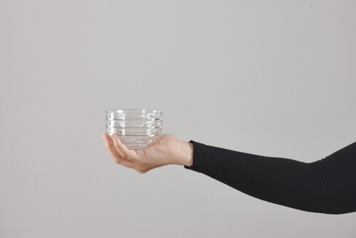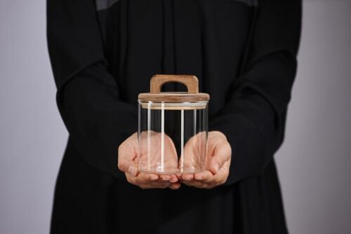 امرأة ترتدي عباءة سوداء تحمل أدوات زجاجية مختلفة في أوضاع متعددة