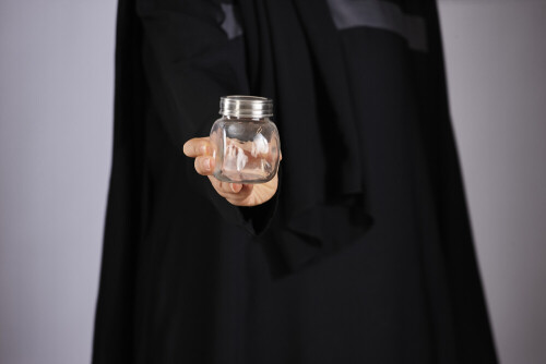 امرأة ترتدي عباءة سوداء تحمل أدوات زجاجية مختلفة في أوضاع متعددة