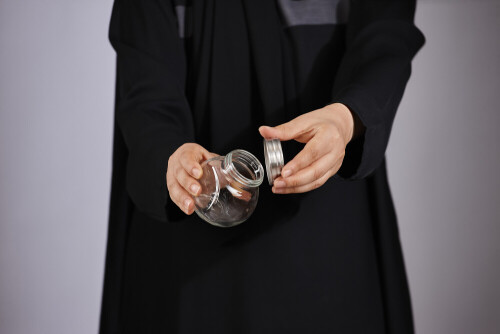 امرأة ترتدي عباءة سوداء تحمل أدوات زجاجية مختلفة في أوضاع متعددة
