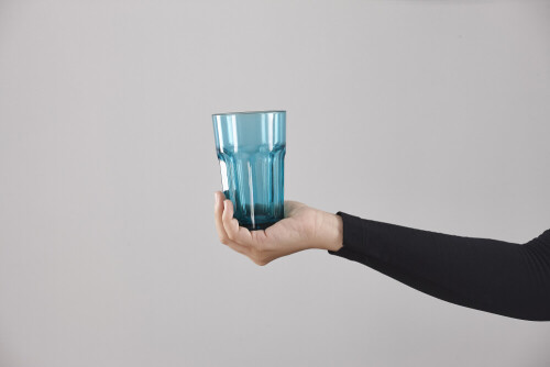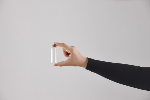 امرأة ترتدي عباءة سوداء تحمل أدوات زجاجية مختلفة في أوضاع متعددة