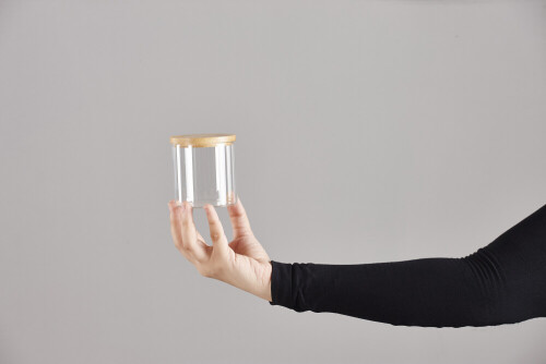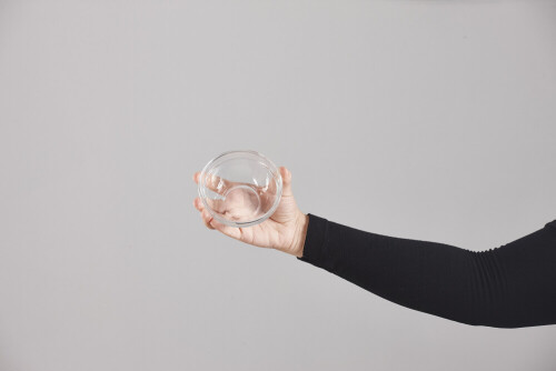 امرأة ترتدي عباءة سوداء تحمل أدوات زجاجية مختلفة في أوضاع متعددة