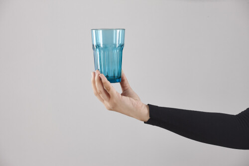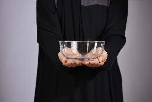 امرأة ترتدي عباءة سوداء تحمل أدوات زجاجية مختلفة في أوضاع متعددة