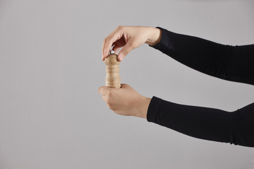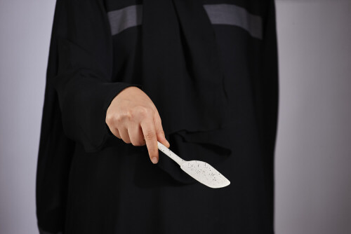 امرأة ترتدي عباءة سوداء تحمل أدوات خشبية مختلفة في أوضاع متعددة