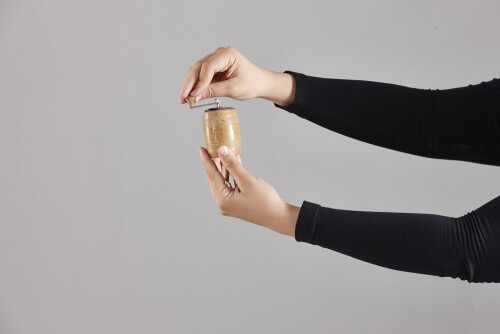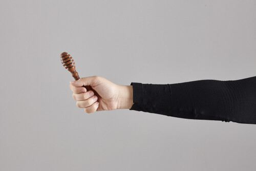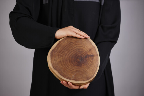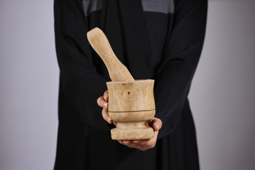 امرأة ترتدي عباءة سوداء تحمل أدوات خشبية مختلفة في أوضاع متعددة
