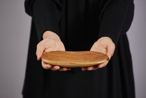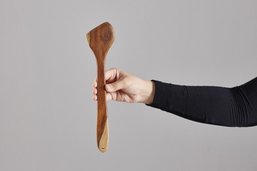 امرأة ترتدي عباءة سوداء تحمل أدوات خشبية مختلفة في أوضاع متعددة
