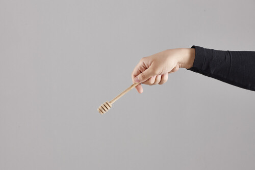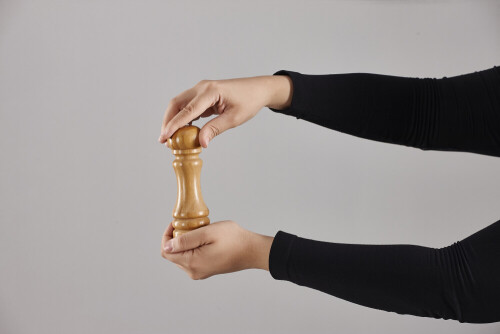 امرأة ترتدي عباءة سوداء تحمل أدوات خشبية مختلفة في أوضاع متعددة
