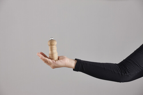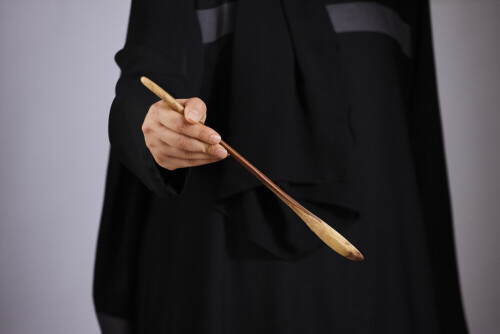 امرأة ترتدي عباءة سوداء تحمل أدوات خشبية مختلفة في أوضاع متعددة