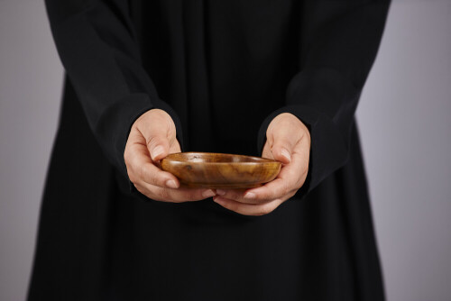 امرأة ترتدي عباءة سوداء تحمل أدوات خشبية مختلفة في أوضاع متعددة