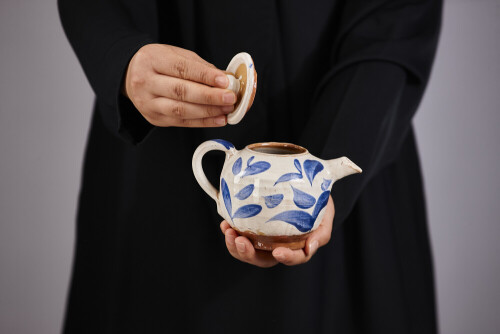 امرأة ترتدي عباءة سوداء تحمل أدوات فخارية مختلفة في أوضاع متعددة