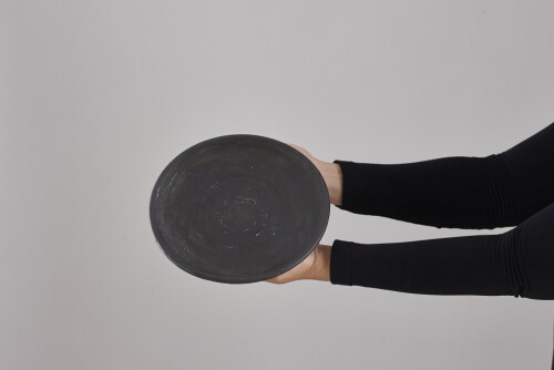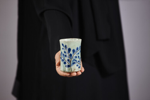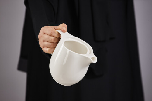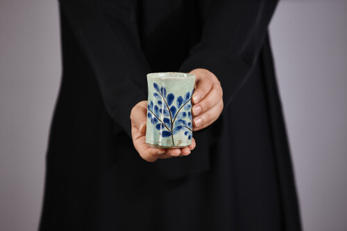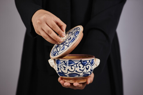 امرأة ترتدي عباءة سوداء تحمل أدوات فخارية مختلفة في أوضاع متعددة