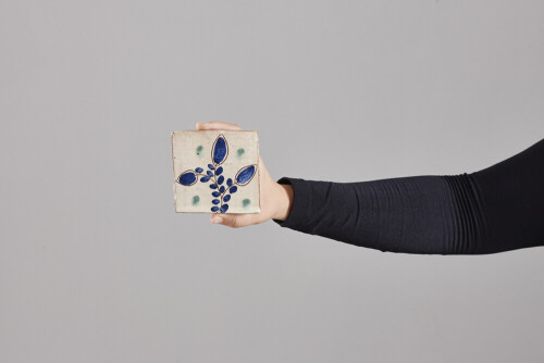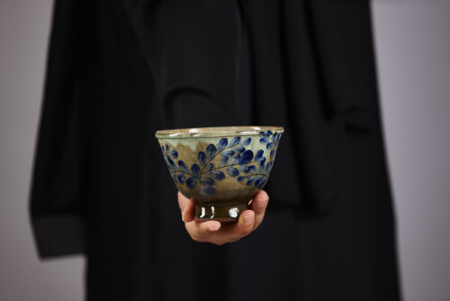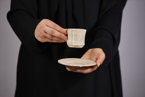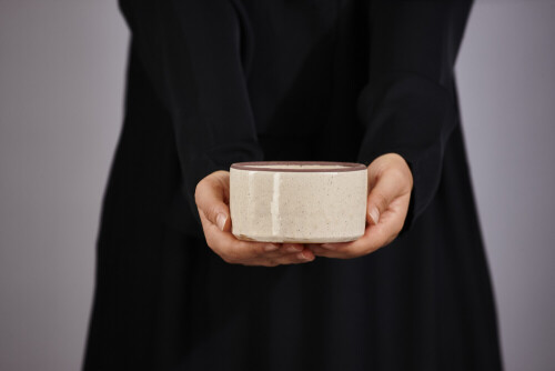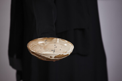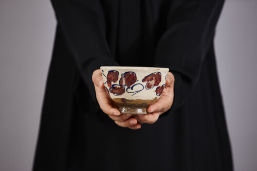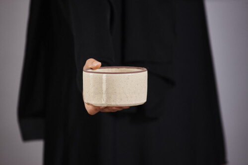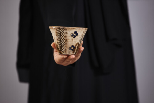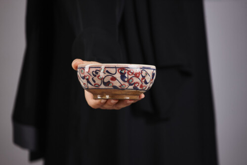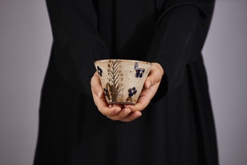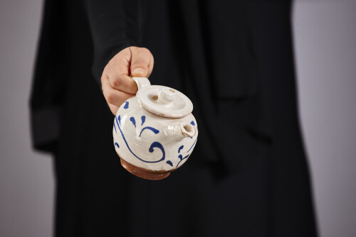 امرأة ترتدي عباءة سوداء تحمل أدوات فخارية مختلفة في أوضاع متعددة