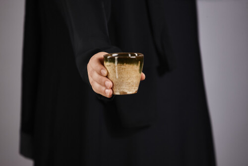 امرأة ترتدي عباءة سوداء تحمل أدوات فخارية مختلفة في أوضاع متعددة