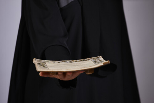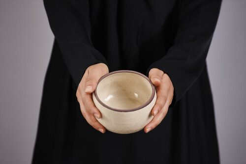 امرأة ترتدي عباءة سوداء تحمل أدوات فخارية مختلفة في أوضاع متعددة