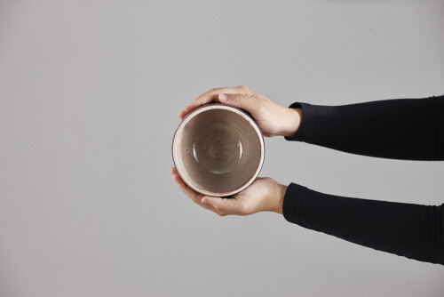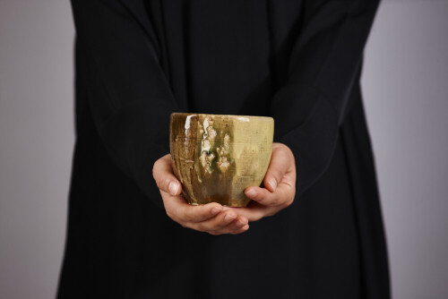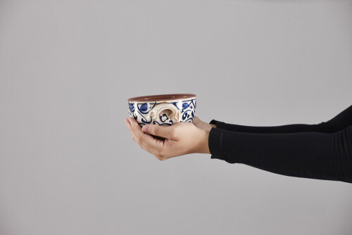 امرأة ترتدي عباءة سوداء تحمل أدوات فخارية مختلفة في أوضاع متعددة