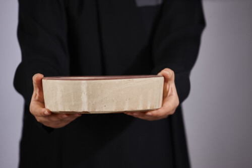 امرأة ترتدي عباءة سوداء تحمل أدوات فخارية مختلفة في أوضاع متعددة