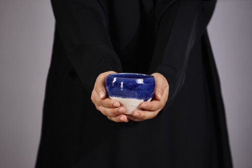 امرأة ترتدي عباءة سوداء تحمل أدوات فخارية مختلفة في أوضاع متعددة