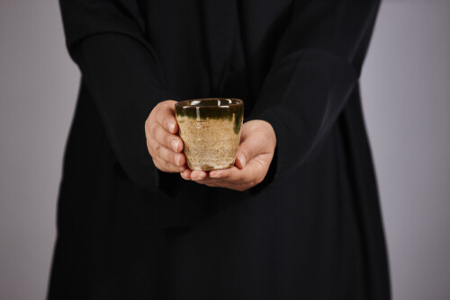 امرأة ترتدي عباءة سوداء تحمل أدوات فخارية مختلفة في أوضاع متعددة