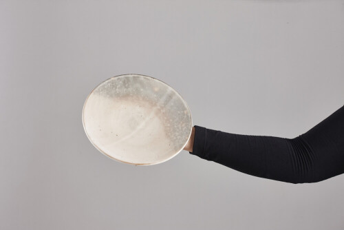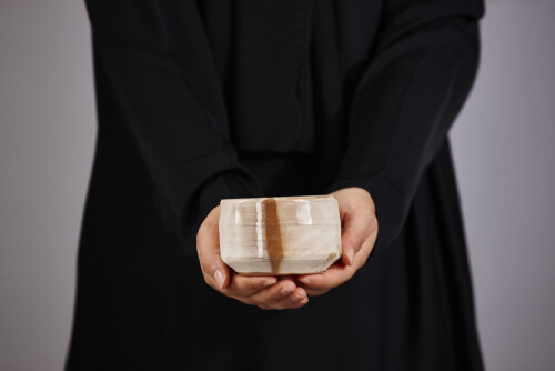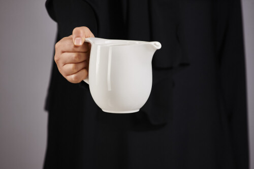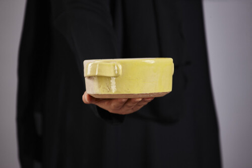 امرأة ترتدي عباءة سوداء تحمل أدوات فخارية مختلفة في أوضاع متعددة