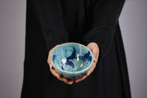 امرأة ترتدي عباءة سوداء تحمل أدوات فخارية مختلفة في أوضاع متعددة