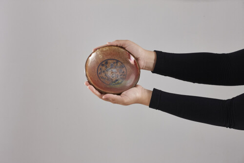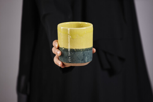 امرأة ترتدي عباءة سوداء تحمل أدوات فخارية مختلفة في أوضاع متعددة