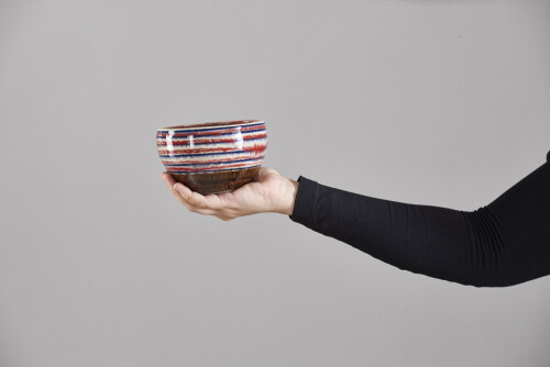 امرأة ترتدي عباءة سوداء تحمل أدوات فخارية مختلفة في أوضاع متعددة