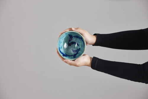 امرأة ترتدي عباءة سوداء تحمل أدوات فخارية مختلفة في أوضاع متعددة