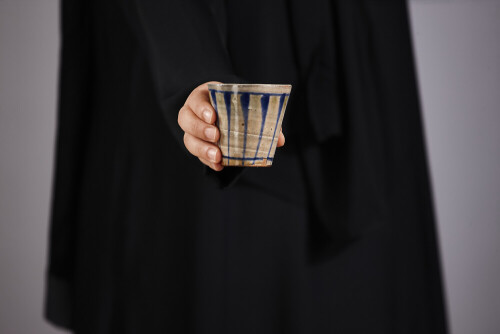 امرأة ترتدي عباءة سوداء تحمل أدوات فخارية مختلفة في أوضاع متعددة