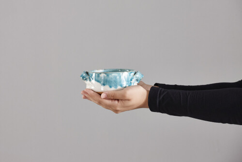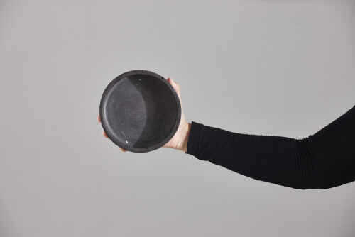 امرأة ترتدي عباءة سوداء تحمل أدوات فخارية مختلفة في أوضاع متعددة