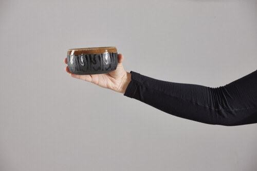 امرأة ترتدي عباءة سوداء تحمل أدوات فخارية مختلفة في أوضاع متعددة