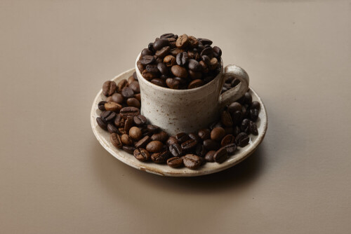 كوب فخاري بيج ممتلئ بحبوب القهوة المحمصة على خلفية بيج