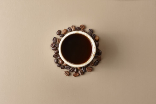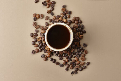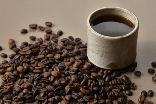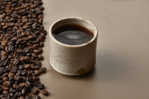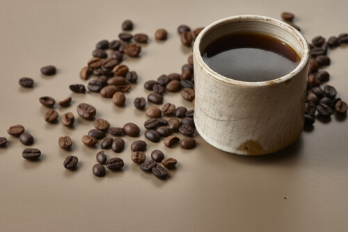 فنجان قهوة من الفخار البيج محاط بحبوب قهوة محمصة على خلفية بيج