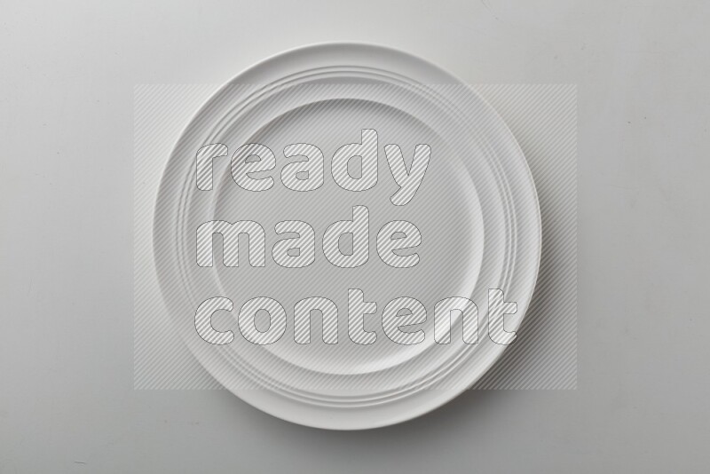 Top-view shot of a circular white plate on white background