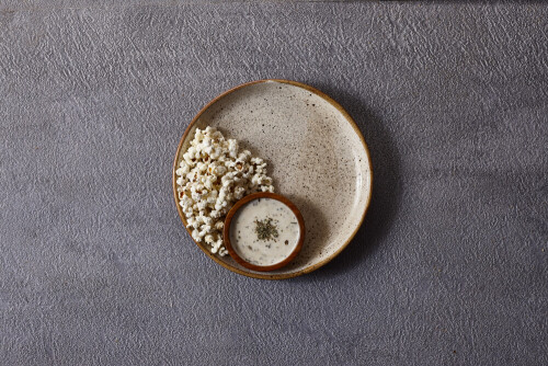 Assorted snacks in pottery bowls on grey background